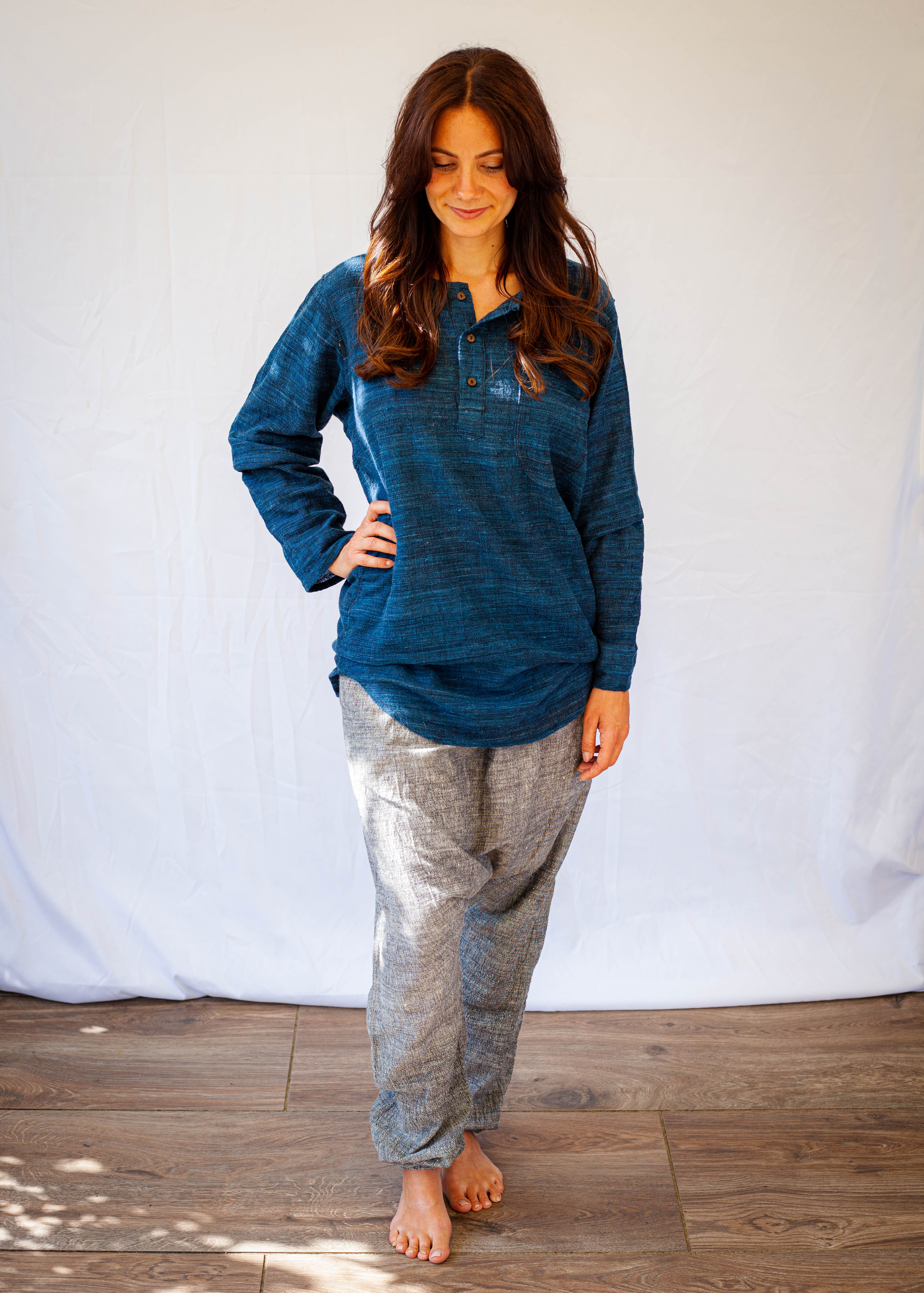 Handgewebte Baumwolle ist atmungsaktiv und angenehm zu tragen, insbesondere bei warmem Wetter. Yasha fühlt sich leicht und luftig an und verhindert, dass man ins Schwitzen gerät.