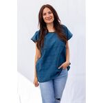 Lachendes, weibliches Model, mit Fokus auf das gelbe Rundhals-T-Shirt