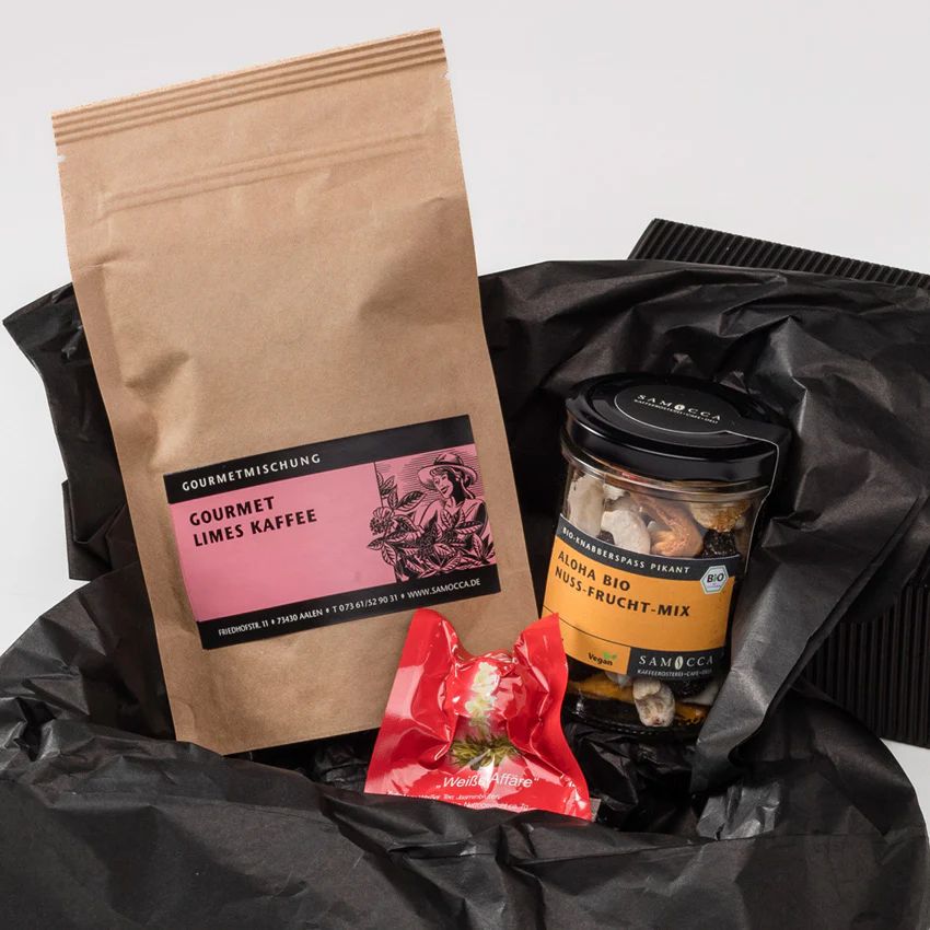 Der kleine Geschenkkorb Kleine Auszeit vereint ausgewählte Genussmomente für eine entspannte Pause im Alltag. Der aromatische Gourmet Limes Kaffee sorgt für belebenden Kaffeegenuss, während der Bio Nuss Frucht Mix „Aloha“ mit fruchtig nussiger Vielfalt verwöhnt. Die Erblühtee Kugel macht die Auszeit mit einem besonderen Teemoment perfekt. Dieses liebevoll zusammengestellte Geschenk ist ideal für alle, die sich eine kleine Auszeit gönnen möchten.