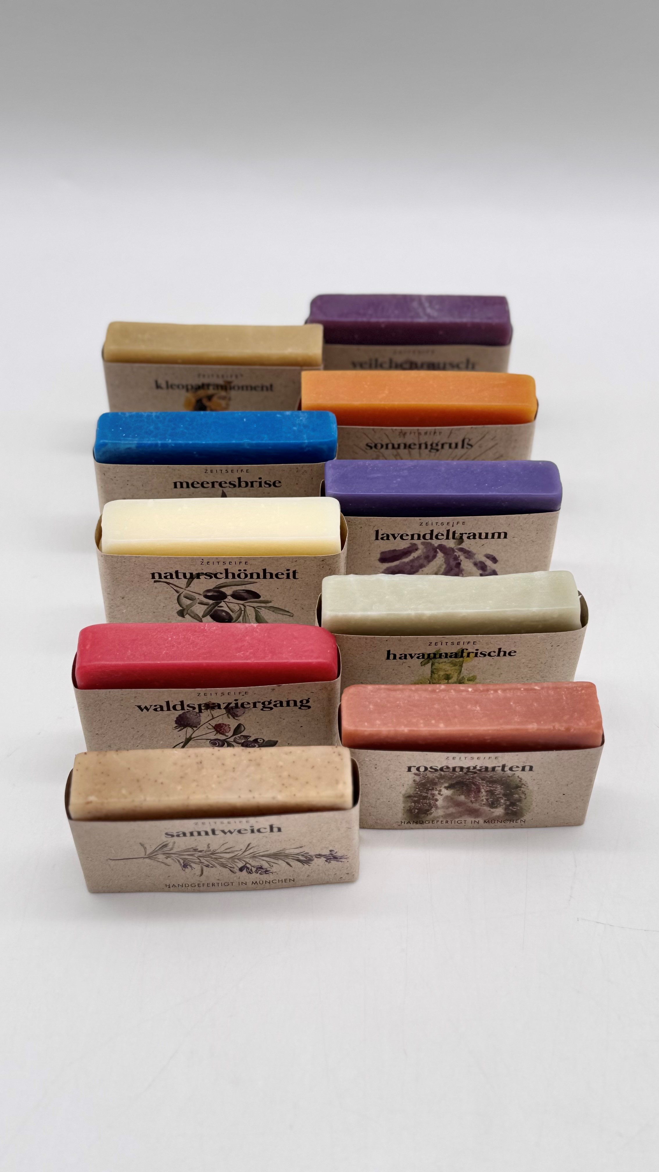Die ZEITSEIFEN Minis zum Probieren, Entdecken und Lieben lernen. Das Paket besteht aus den 10 ZEITSEIFEN-Kreationen:
