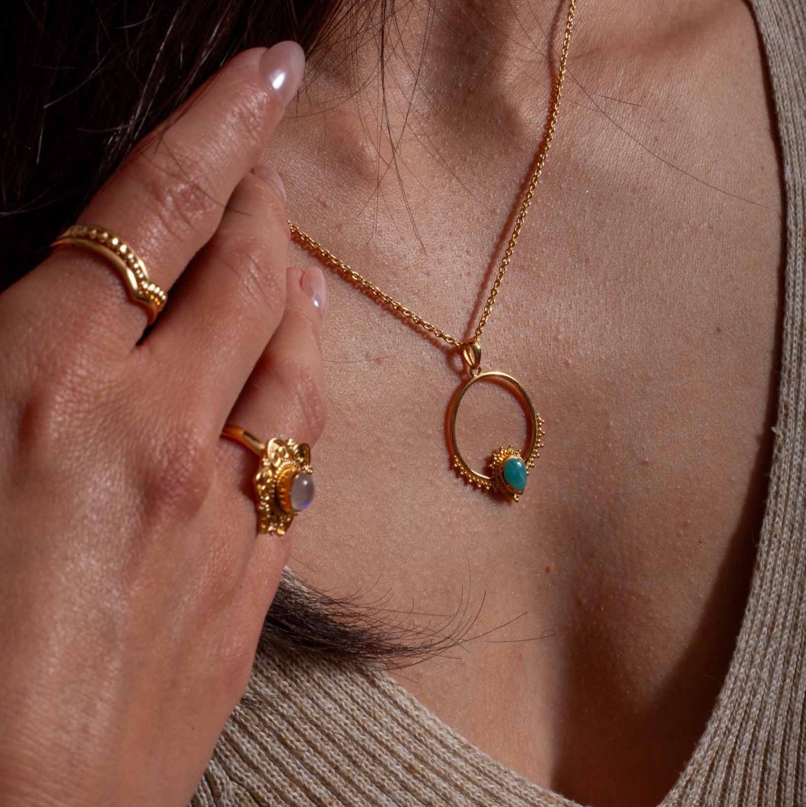 Naïra – strahlend, anmutig, voller Energie. Dieser kunstvolle Anhänger verbindet die natürliche Schönheit eines leuchtenden Steins mit verspielten Details, die an alte Kulturen und zeitlose Eleganz erinnern. Naïra fängt das Funkeln des Lichts ein und verleiht dir eine Aura von Freiheit und Sinnlichkeit – ein Schmuckstück, das Geschichten erzählt und deine Ausstrahlung zum Leuchten bringt.