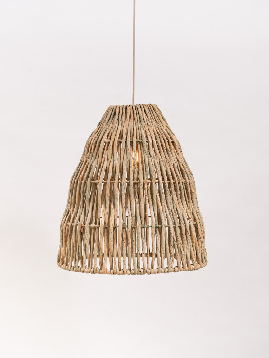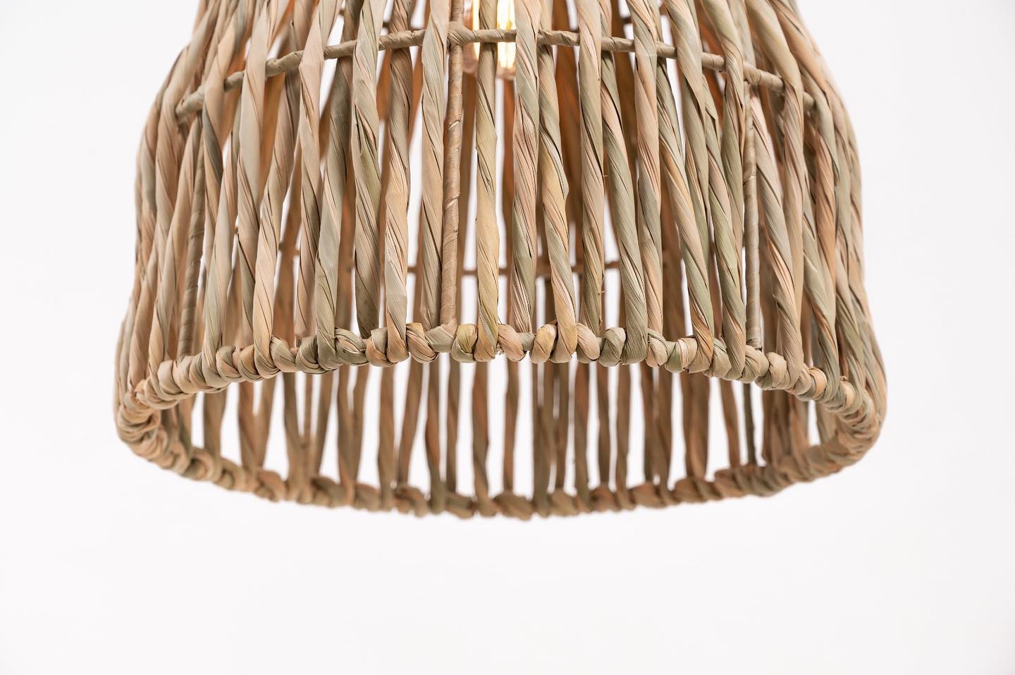 unserer Leuchte Nyima ist das Detail ihres Geflechts: Naturfaser mit gedrehten und verschlungenen Fasern, die bei Beleuchtung ein Spiel aus Licht und Schatten erzeugen.