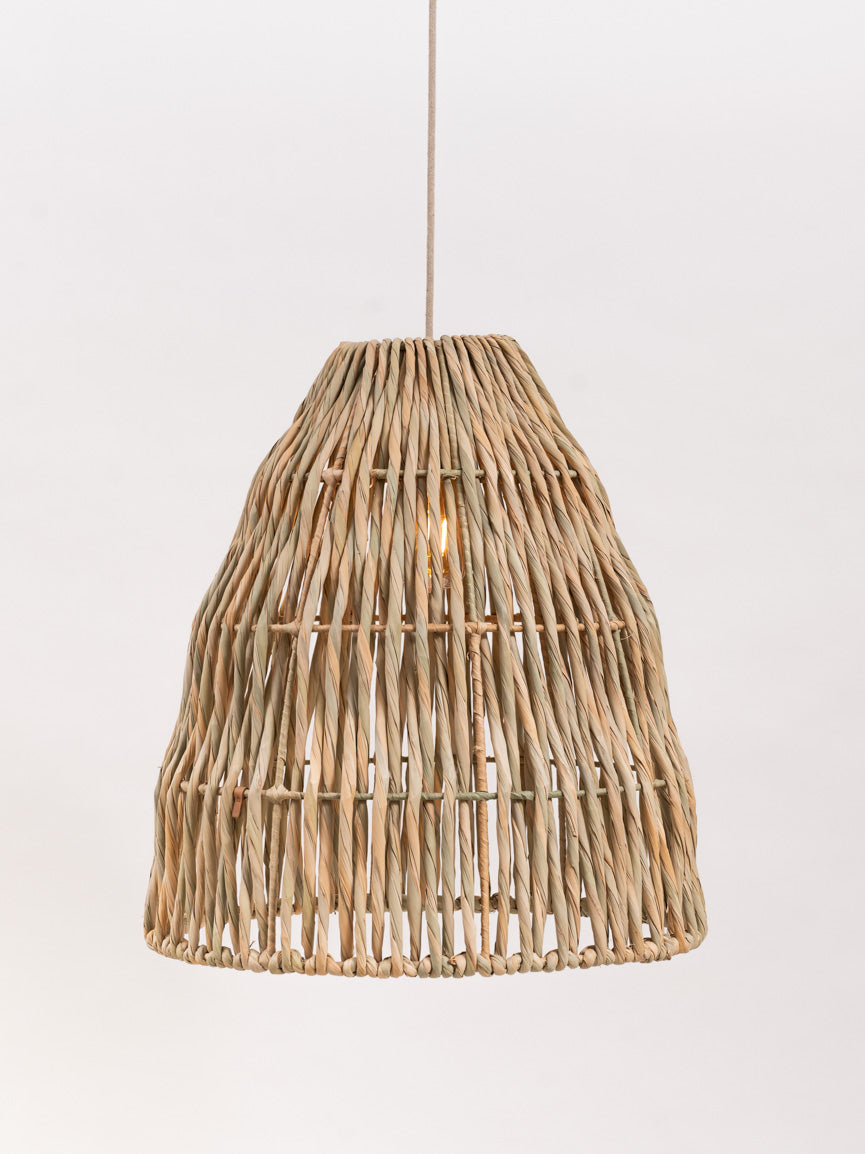 unserer Leuchte Nyima ist das Detail ihres Geflechts: Naturfaser mit gedrehten und verschlungenen Fasern, die bei Beleuchtung ein Spiel aus Licht und Schatten erzeugen.