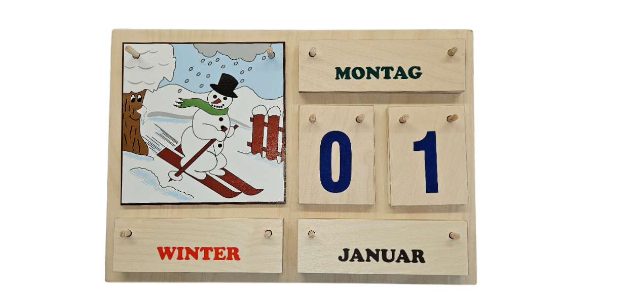 Die Kalender der Christophorus-Werkstätten bestehen aus hochwertigem Sperrholz und geben ganz nach dem Second Life Prinzip Materialien eine zweite Chance. Sie sind ein nachhaltiger, ganzjähriger Einrichtungsgegenstand, die Freude in dein Zuhause bringen! Wie funktioniert er? Es gibt ein großes Brett, auf dem du die Jahreszeiten, die Wochentage und das konkrete Datum selbst ändern kannst. Er ist ein zeitloser Helfer für Zuhause und unterstützt zudem Kitas, Schulen, Seniorentagesstätten und andere Einrichtungen bei der zeitlichen Orientierung. Kinder, Demenzkranke oder Menschen mit Unterstützungsbedarf finden in diesem Kalender einen wundervollen, täglichen Begleiter. Die Zahlen- und Schriftkarten bestehen aus 4mm Sperrholz und werden durch ein Siebdruckverfahren in bunter Schrift bedruckt.