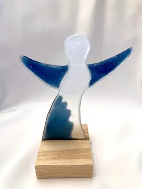 Kunstvoller Glasengel mit Holzaufsteller - blau