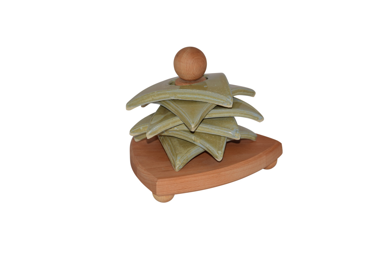 Die dreieckigen Exemplare - 6 Stück auf einem praktischen Holzträger - sind so gearbeitet, dass sie alternativ auch als Serviettenhalter verwendet werden können.