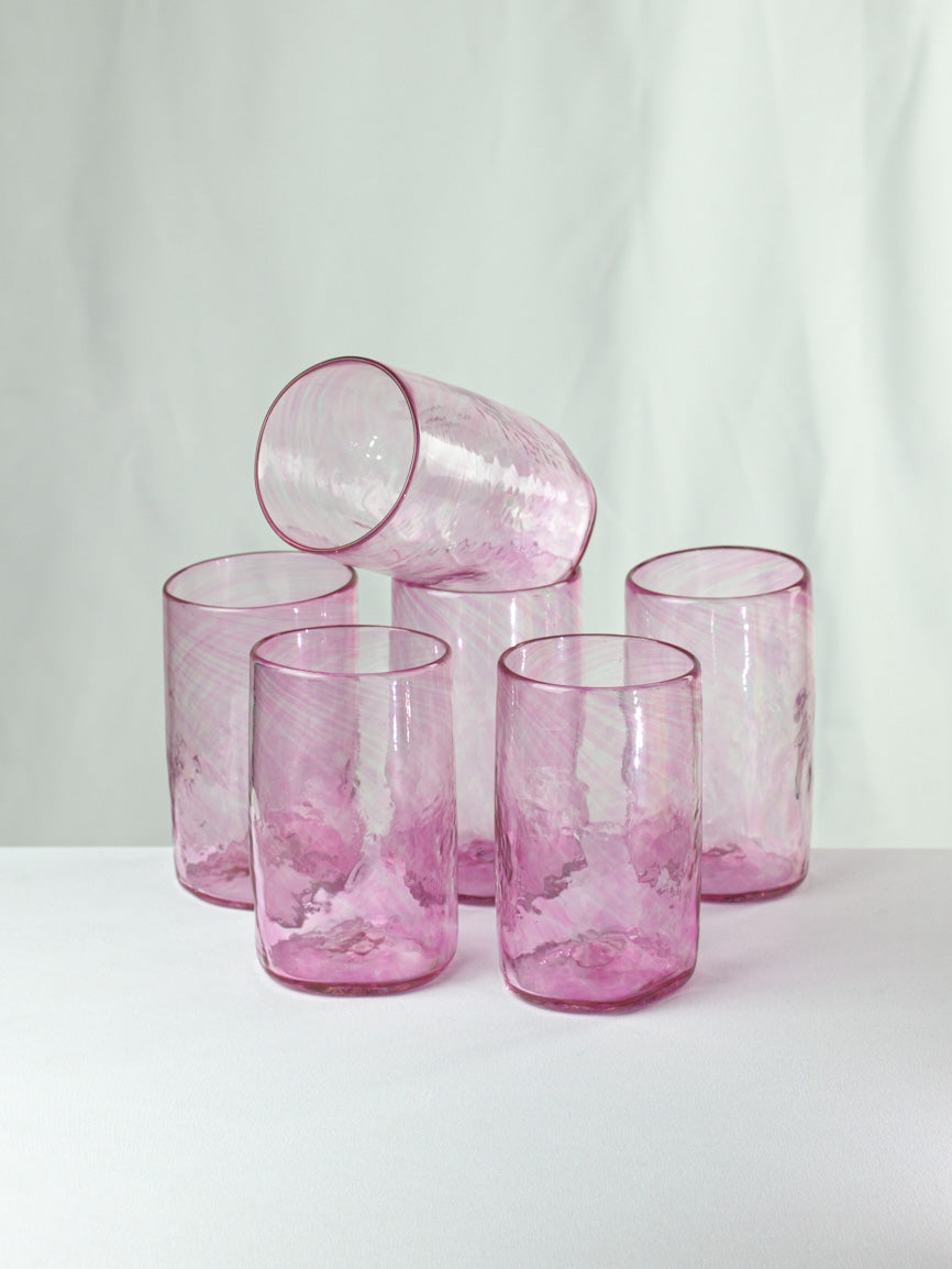 Da jedes Glas von Hand hergestellt wird, ist jedes Stück ein Unikat mit individuellen Merkmalen und Charakteristika. Die unregelmäßige Form und die kleinen Luftbläschen im Glas verleihen ihnen eine rustikale und natürliche Ästhetik, die perfekt für eine gemütliche und entspannte Atmosphäre geeignet ist.